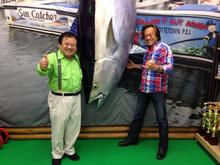 お店にマグロを展示した記念写真